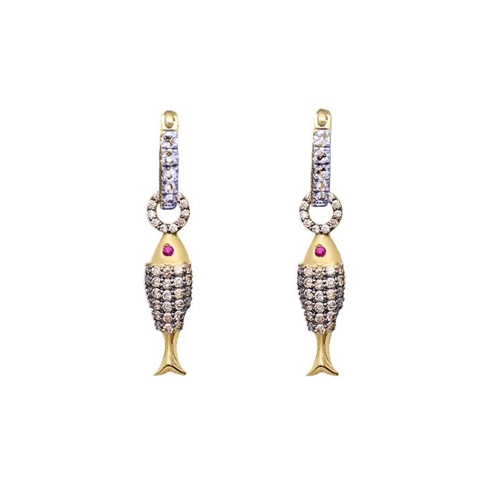 Champagne Diamond Fish Ear Charms crafted in 18 Karat gold and champagne diamonds with a ruby eye.