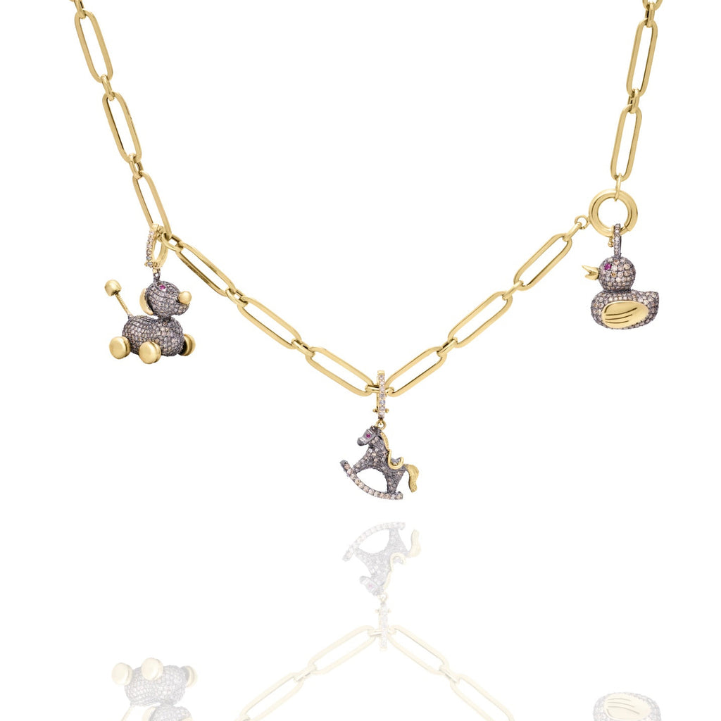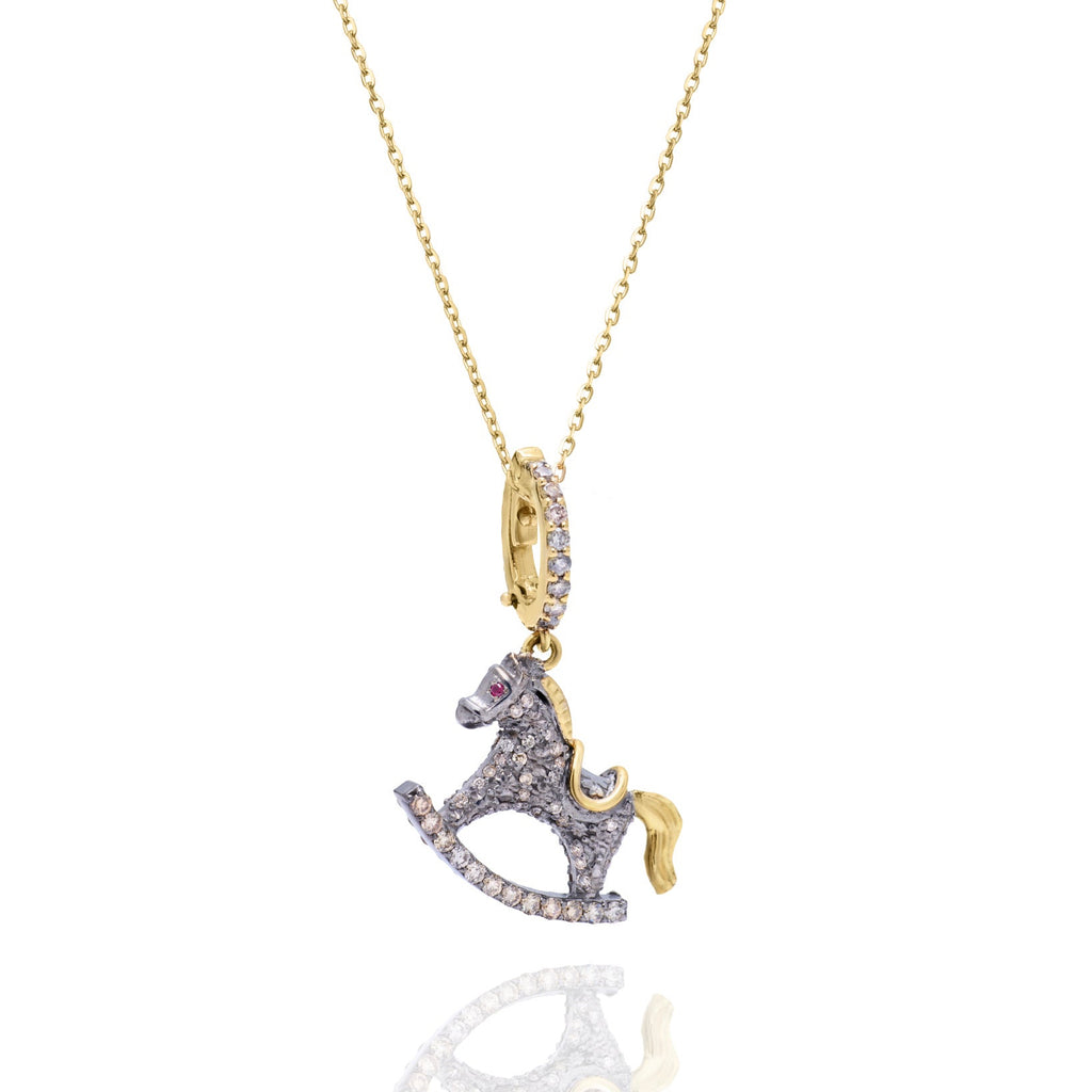 Toffee The Rocking Horse is crafted in 18K gold, sterling silver, champagne diamonds and ruby eyes on a 16"-18" gold chain.