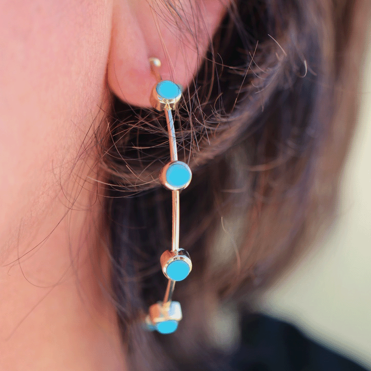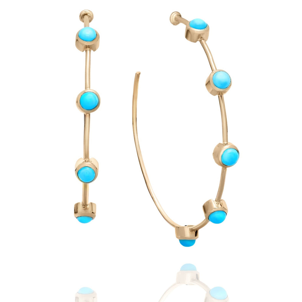 Turquoise Party Hoops are crafted in 18 Karat gold with a total of ten 4mm turquoise cabochons.